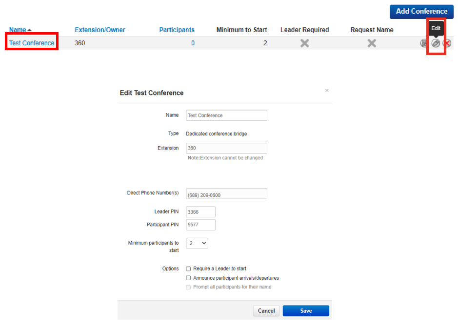 There may be times when you need to edit conferences. For example, you may want to change the leader or participant PIN.