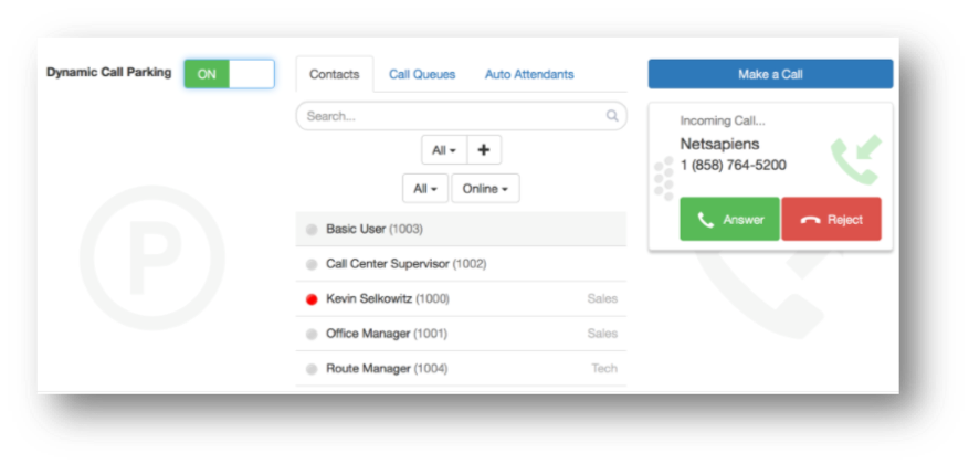 The Attendant Console allows you to park a call with either Dynamic or Static Call Parking. Call Park enables you to put a call into a parking orbit so that another user can then retrieve the call when they are available. Dynamic Call Park will place the caller in the first available parking spot. Static Parking will allow you to park the call on a specific extension.