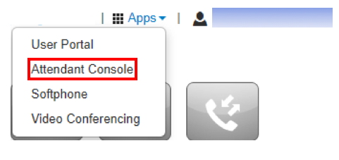 To access the Attendant Console, click on the Apps dropdown in the top righthand corner of the User Portal. Select Attendant Console.