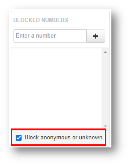 You can block all anonymous or unknown callers simply by clicking the check box next to Block anonymous or unknown, found under the Blocked Numbers box.