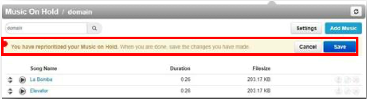 Music on Hold files play according to the order in which they appear in the Music on Hold page, starting with the top file on the page, if the randomization setting is not selected. To change the order in which files are played: