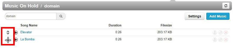 On the left side of the Music on Hold page, hover your mouse over the up/down arrows for the file that you want to move (the pointer changes to a 4-headed arrow).