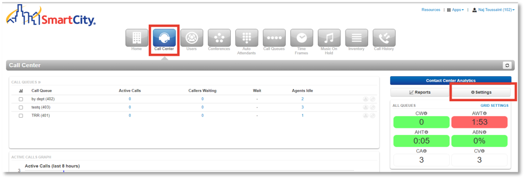 Or navigate to Reports from the Call Center screen and click on Setting.