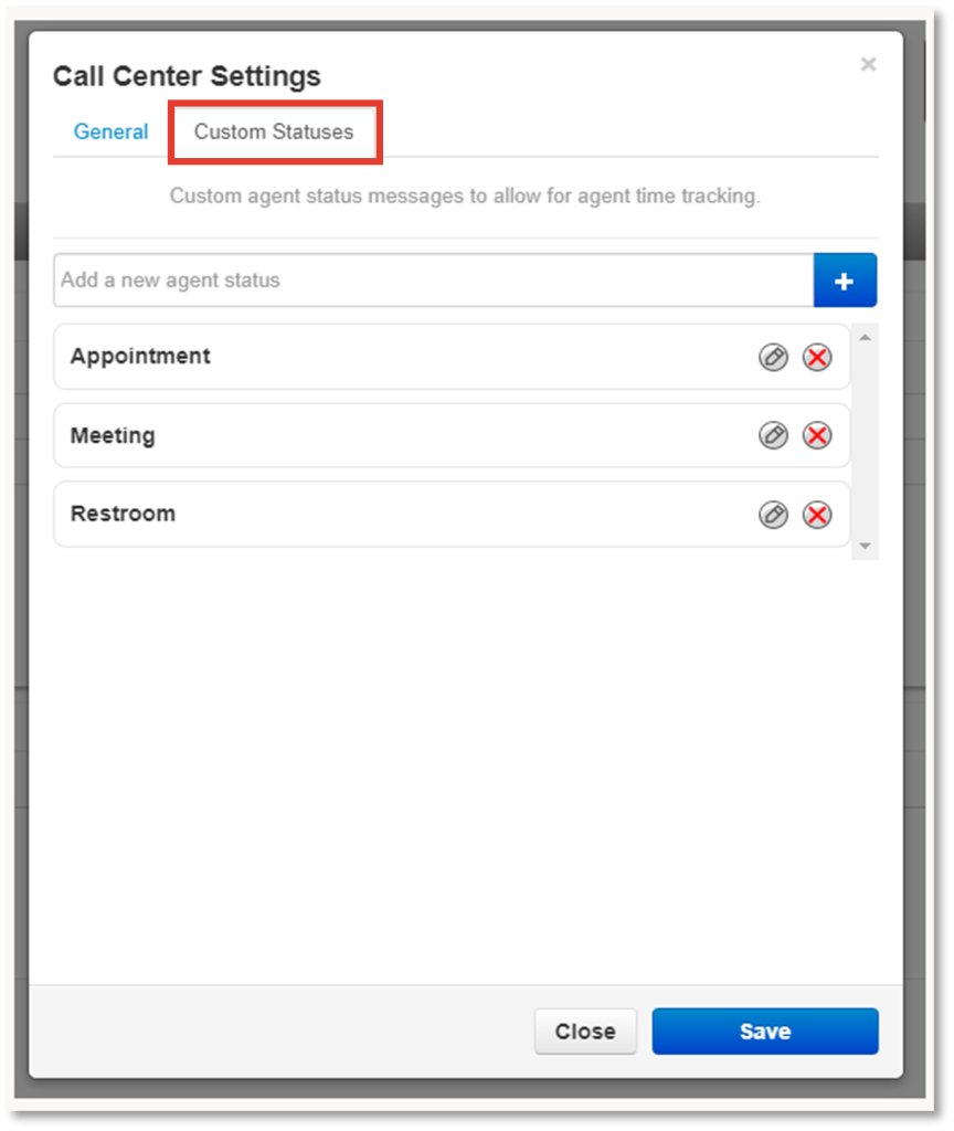 Call Center Supervisors can add custom agent statuses. Pre-defined statuses are broad descriptions such as “lunch”, “break”, and “available”. A custom status gives the Supervisor increased granularity on Call Center Reports.
