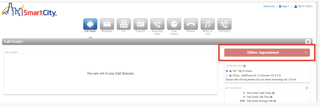 Custom statuses are available to agents in two places: in the Call Center Agent home page as part of the portal and in the Smart City Mobile app under the Call Center tab.