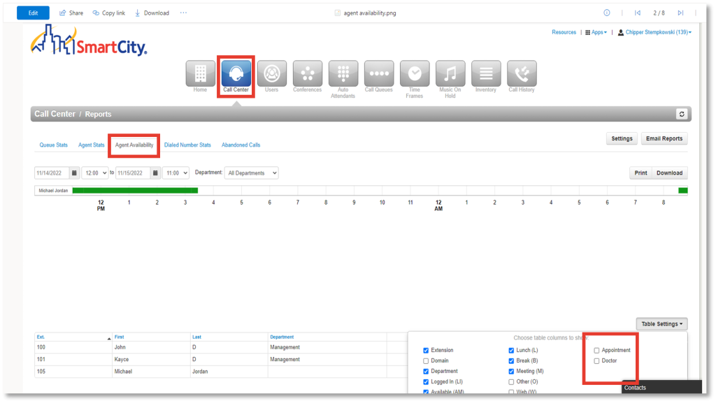 1. Navigate to the Agent Availability tab in Call Center Reports. Click Table Settings and then check or uncheck custom stats.