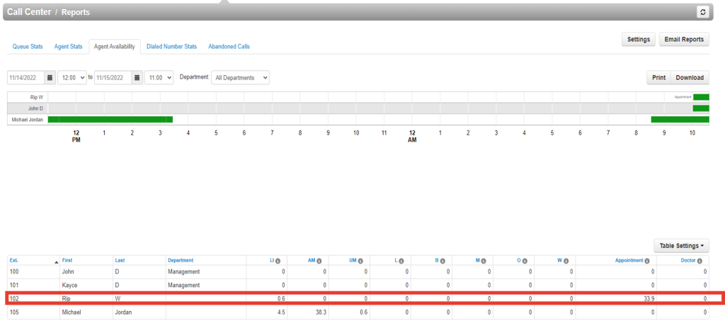 In the example below, the Call Center Supervisor sees that the user named “Rip ” was at an appointment for 33.9 minutes. today (90 seconds) and in the bathroom for 0.2 minutes (20 seconds). Total time is reported in minutes.