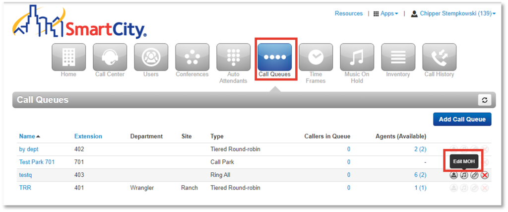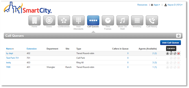 1. Navigate to the Call Queue screen and select the Edit MoH icon across from a call queue.