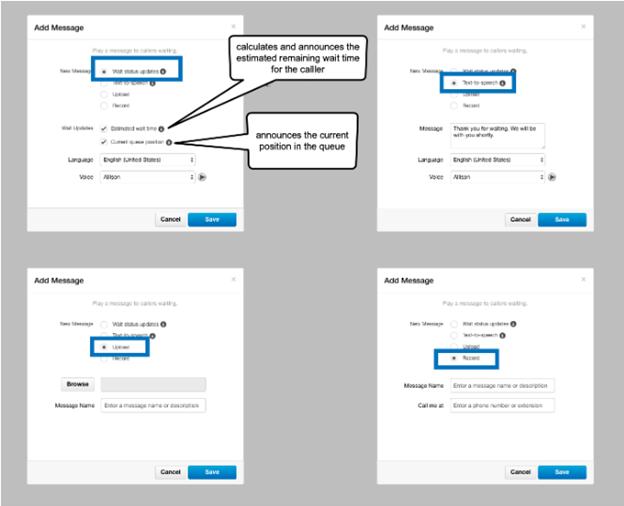 Customizable Music on Hold gives you the ability to insert Music on hold and messages into audio that is already playing while a customer is on hold. For example, when a customer is on hold, the music can be briefly interrupted with a message such as “Your call is important to us. Please continue to hold, and a representative will be with you shortly.” This is often referred to as a comfort message – a message or recording that reassures the caller not to hang up. This message can be used for advertising, to announce schedule changes, to announce promotions, or to specify wait times. You can copy this message, and the time between messages is configurable.