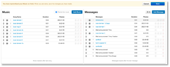 3. To change the order or music or message, drag and drop the row. Click Save. Music and messages can be re-ordered at the same time.