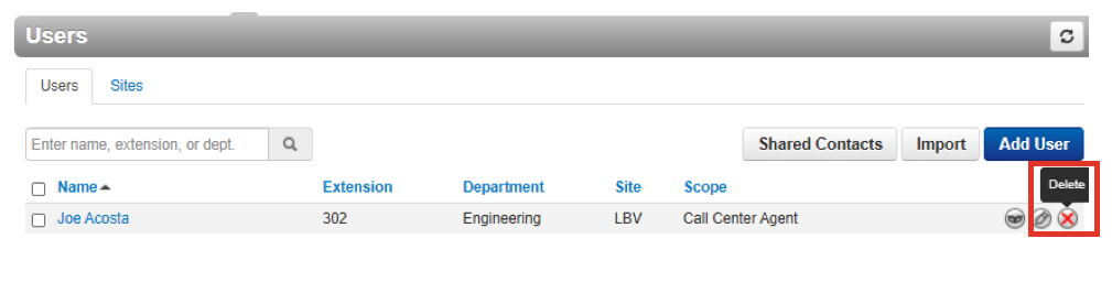 - From the User’s page, hover over the user, and the click the Delete icon at the far right of the row.