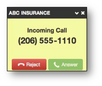 Incoming calls appear in a window in the portal as shown in the example below. This window shows the Caller ID name and number, along with Reject and Answer buttons.