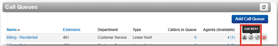 If you want to edit the Music on Hold that is played in Call Queues, click on the Edit MOH icon.