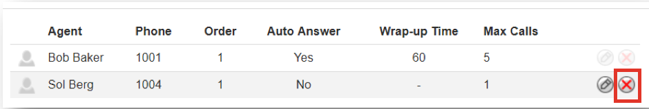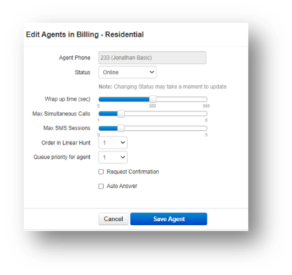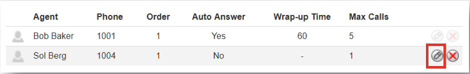 The Edit Agent icon will take you to the Edit Agents page, as shown below. Here, you can add agents to the queue, modify their ability to receive calls, and limit their ability to receive calls at one time.