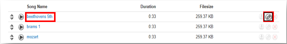 If you need to edit the name of the Music on Hold file, from the Music on Hold page, either click a file name, or hover over a file name, and then click the edit icon on the far right side of the Music on Hold page.