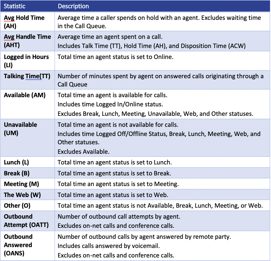 This section provides an example of each type of report you can generate in the Call Center Reporting tool. It also describes the individual statistics you can include in the generated reports.