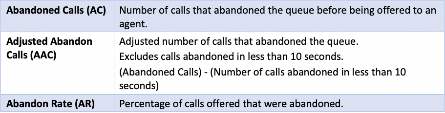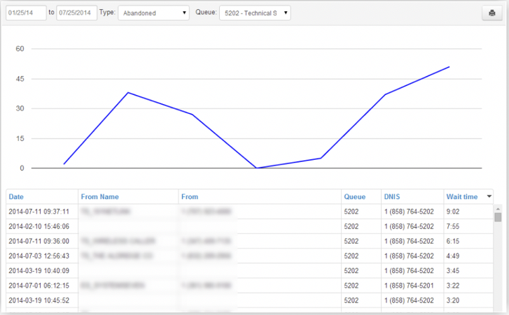 The Abandoned Calls report shows call center graphs for abandoned calls, organized by individual queues. Time is measured along the x-axis and the number of calls abandoned is measured along the y-axis. All of the abandoned calls for the queue appear below the graph, along with statistics about each individual call.
