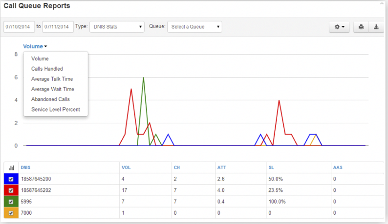 NOTE: You can click the checkboxes in the 1st column for DNIS statistics to graph them individually; as shown in the above screenshot with the different colored rows. Also, clicking on the 1st column header (the bar graph icon) will toggle all the checkboxes On/Off.