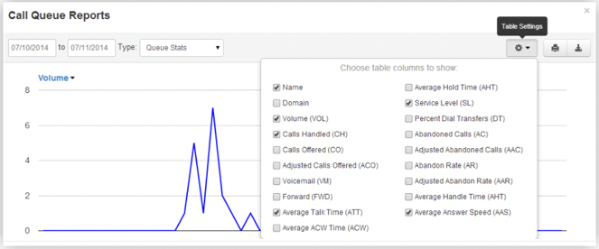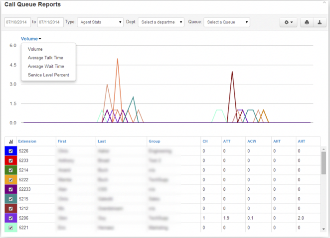 NOTE: You can click the check boxes in the first column for Call Queue statistics to graph them individually, as shown in the above figure with the different colored rows. Clicking the first column header, which shows the bar graph icon, toggles all checkboxes On or Off.