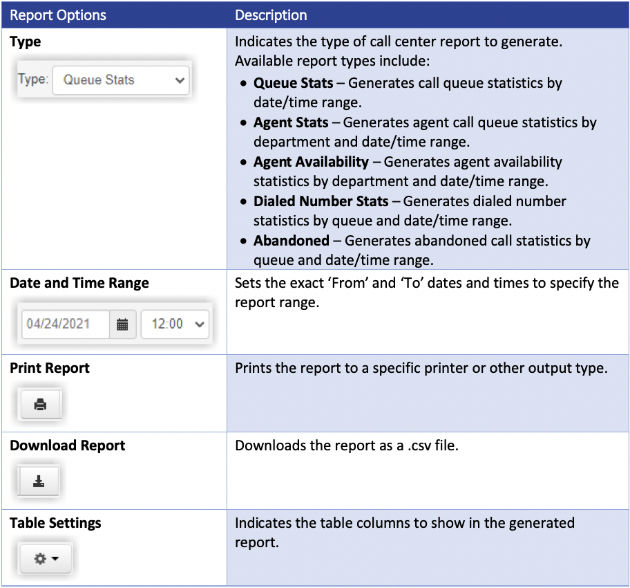 The following table describes each setting available on the Call Center Reports dialog box to generate a report:
