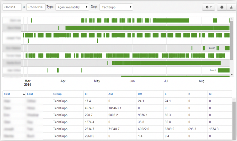 When configured, and when agents have been signing in and out, supervisors can see an agent availability display like the following: