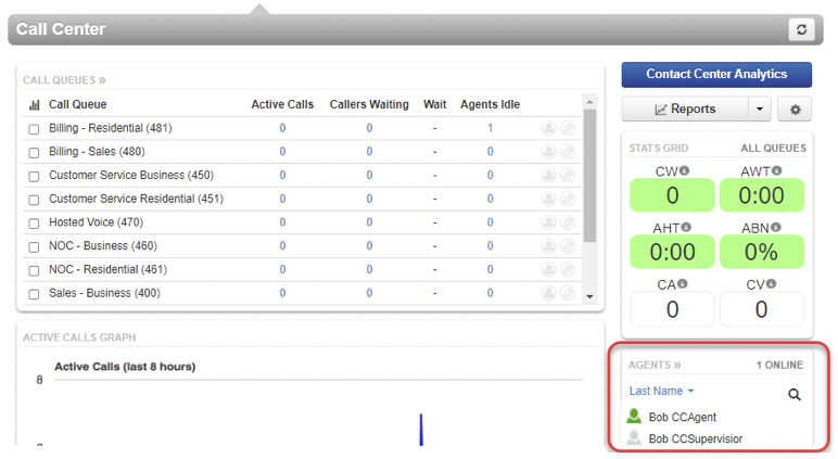 Call agent supervisors and office managers can view call center agent information to determine agent call activity and performance levels. For each call agent extension in your domain, you can view agent statistics and call-queue priorities. You can also access call recordings for an agent if call recording is enabled.