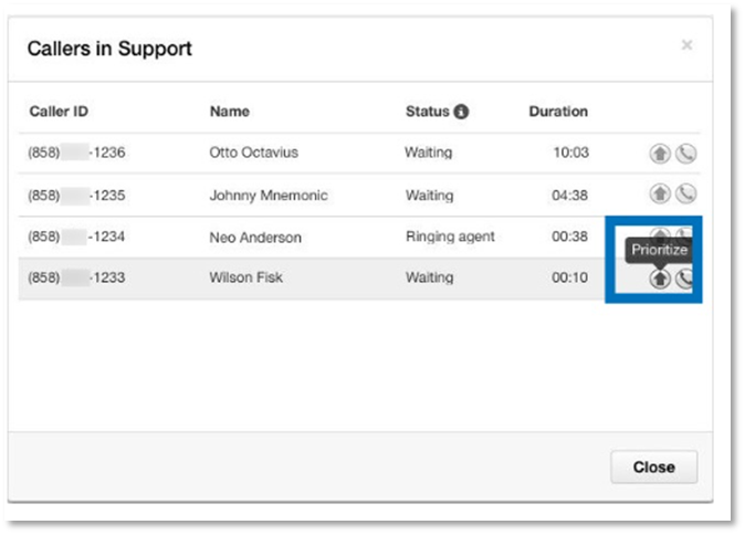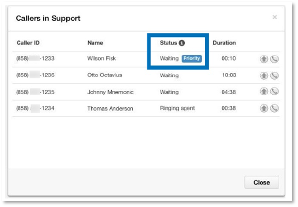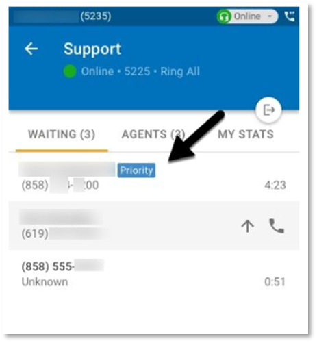 The caller will move to the top of the call queue list. Their Status will now have a “priority” tag. All priority calls move to the top of the queue, in order of longest “Duration”.