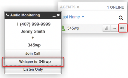 - Whisper – Allows you to access an agent’s current call to speak to the agent; however, the caller the agent is speaking with will not hear you speak to the agent. With the whisper feature, you can engage with the agent and yet be invisible to the caller.