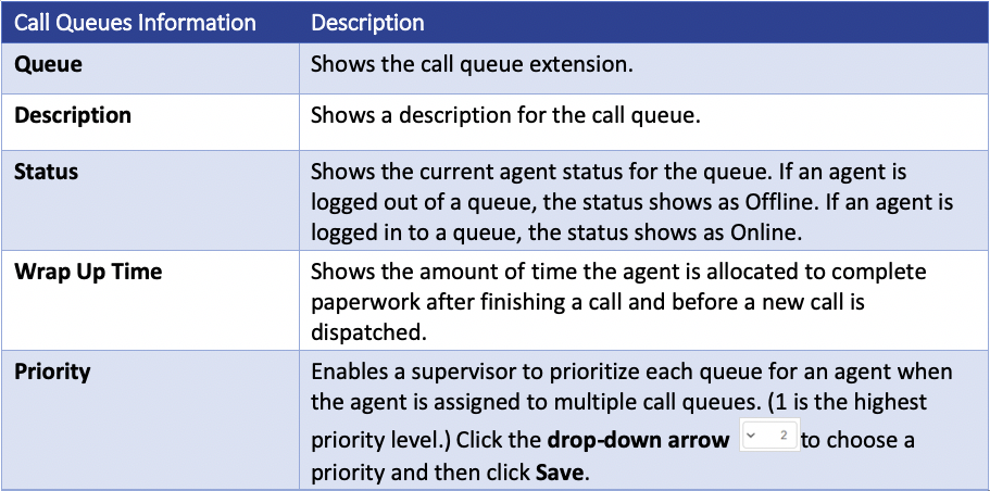 - Make changes to the queue priorities as needed and then click Save. Refer to the Call Queue option descriptions on the next page.
