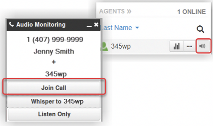 - Join in on the agent’s current call as needed. You can speak to the agent, but the caller will not hear you.
