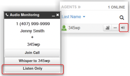 - Listen – Allows you to only listen in on an agent’s current call. No audio is passed to the agent or the caller to whom they are speaking. With the listen feature, you are an unnoticed observer on the call.