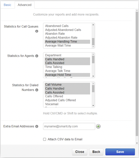 Call Center enables call center supervisors and office managers (with call center functionality enabled) to request emailed reports in a variety of formats and time windows. Advanced settings also allow you to pick a few of the most important statistics to be viewed prominently in the email body.