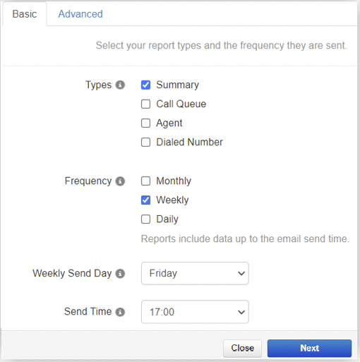 On the Advanced tab, each report type you select will be generated and emailed based on the report frequency options set.