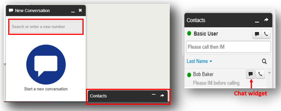To start a new conversation, click the New Conversation button and a new chat window will appear. Start typing the user’s name or press down to see a list of everyone in the organization you can select from. Opening the Contacts in the lower right corner will open up a list of everyone in the organization. Click the chat box next to their name. After clicking one of the options, a chat window will appear.