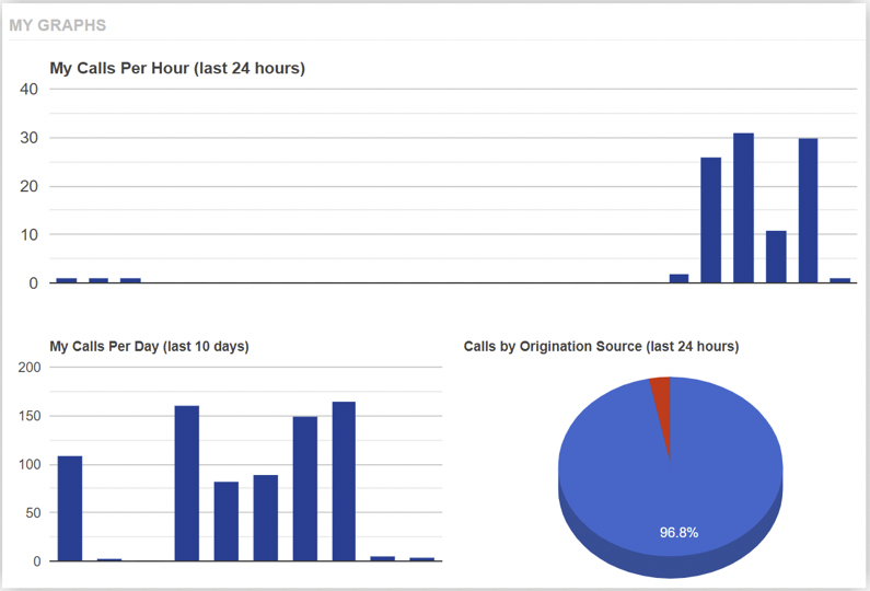 The MY GRAPHS section of the Call Center Agent dashboard displays a chart graph of an agent’s call totals per hour, over the past 24 hours; and per day, over the last 10 days. This section also displays a pie chart to show from where the agent’s inbound calls originated.