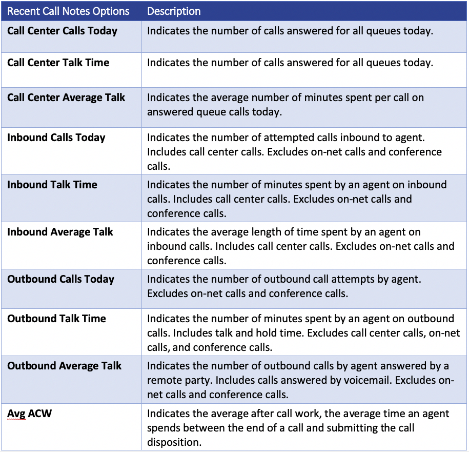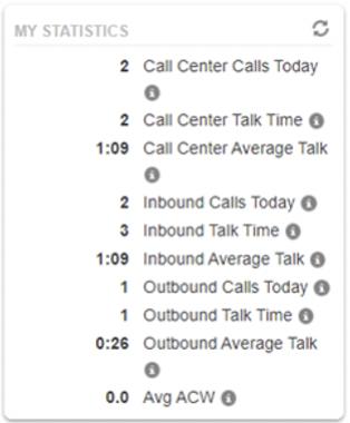 The statistics that show include important information, such as Number of Call Center Calls Taken, Average Talk Time, and number of Inbound and Outbound calls.